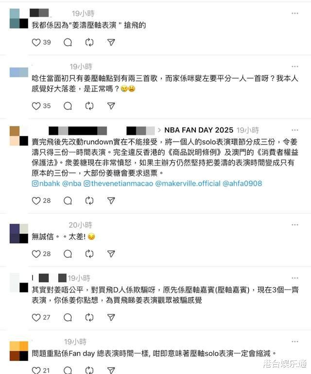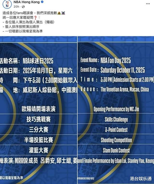 稍早前,NBA香港方面通过其社交账号进行了回应。回应内容称,对给各位艺人粉丝造成的误会感到抱歉,表演嘉宾会按照演出顺序登场,一切以现场呈现为准。