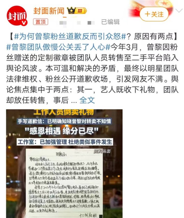 但话又说回来了,要是当初她面对“粉丝礼物”事件也能这么真诚,想来现在也不会到万人嫌的地步。