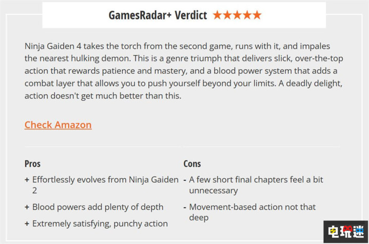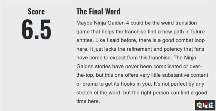 《忍者龙剑传4》完美承袭《忍者龙剑传2》精髓并自然演进,血楔系统极大拓展战斗深度,拳拳到肉的打击感令人酣畅淋漓。不过游戏的终章部分章节稍显短促多余,基于移动的战斗深度有限。