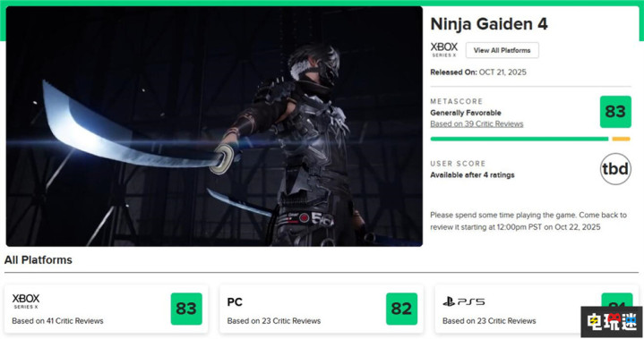 《忍者龙剑传4》的全球媒体评分已经解禁,根据Metacritic的统计,目前XSX版83分(35家好评,4家中评);PC版82分(19家好评,4家中评);PS5版81分(17家好评,5家中评)。大部分评价对于《忍者龙剑传4》的快节奏战斗给出了好评,是系列时隔十余年的强势回归。不过隼龙的戏份与武器过少。