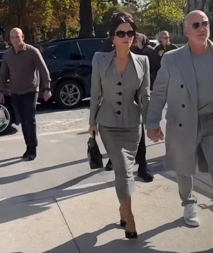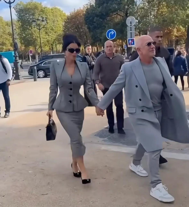 像贝佐斯桑切斯夫妇,俩人抵达巴黎之前,穿了一套情侣装,本来个子就不高的俩人包裹在这样厚重的衣服下,更显滑稽。不过他们俩自信又享受闪光灯,加上光环和滤镜,他们依旧光彩夺目。