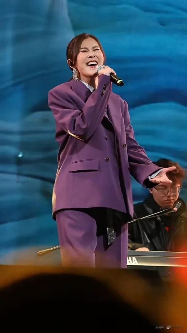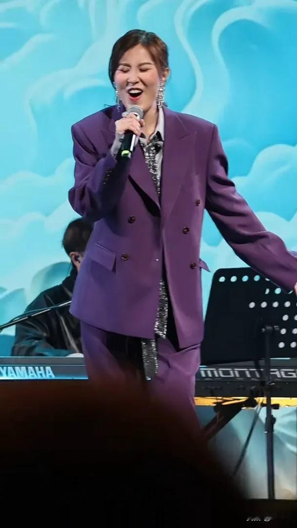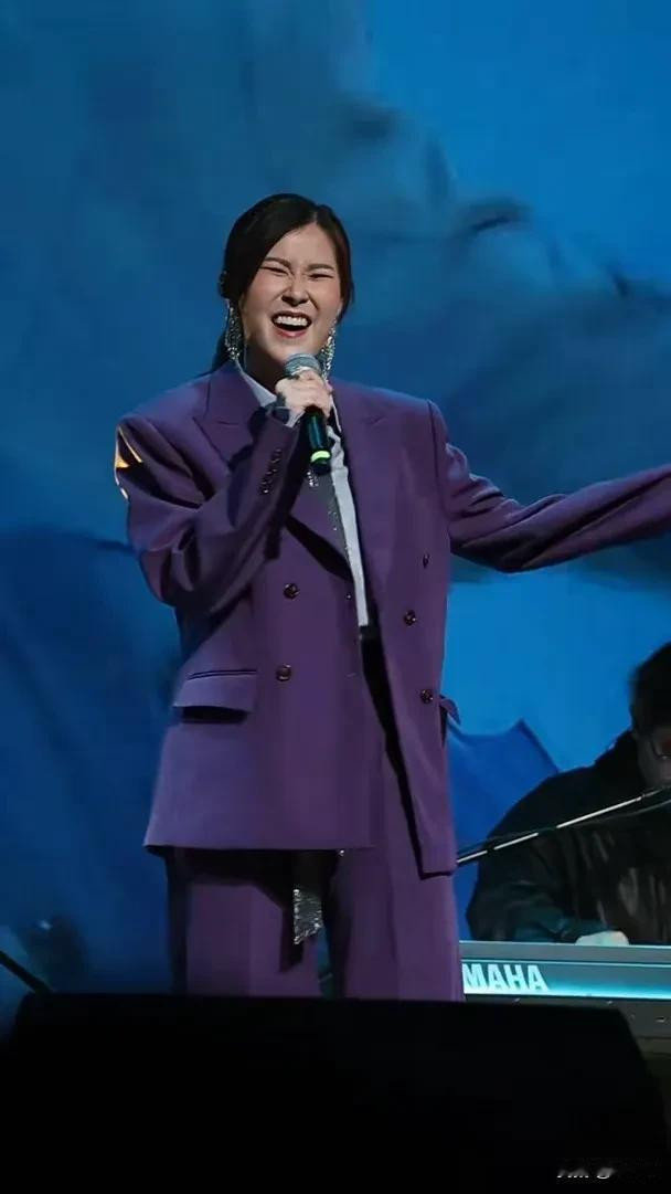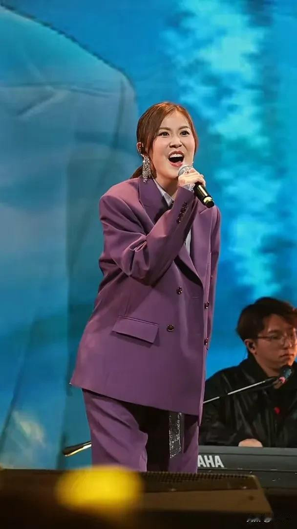 除了表情管理,Moon当晚的舞台造型同样引发讨论。她身穿紫色中性西装亮相,有评论认为该造型线条硬朗,与她一贯温柔形象落差过大,反而放大了舞台上的表情问题。