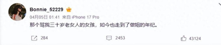 在4月5日,她发了一条“那个骂我的三十岁老女人的女孩,也到了做姐的年纪”。