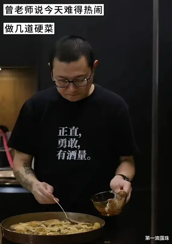 掌勺的是梅婷老公曾剑,他穿着件印着“正直、勇敢、有酒量”的趣味T恤,烤得滋滋冒油的烤肉切好,配上现摘蔬菜烹饪,烟火气直接拉满。