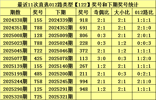 前10次直选122组合出现之后,其下期奖号分别为:918、691、806、228、372、113、267、211、994、948,其中奖号奇偶总比例为15:15,012路总比例为11:10:9,大小总比例为14:16。